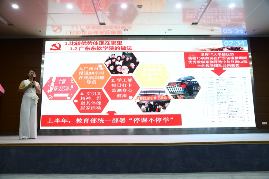 一号选手是来自广东东软公司商务管理公司教师党支部书记李苹绣,她分别以微党课和党支部书记创新工作案例展示的形式,介绍了自己的工作体会和经验。接着,来自广州南洋理工职业公司通识教育公司教师一支部书记闫丽上台,她从支部建设、工作创新、战疫中的党员先锋模范作用等角度,分享了工作中的酸甜苦辣。