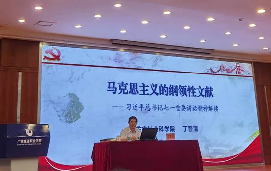 活动第一阶段,全体思政教师在一教四楼报告厅听取了广东省社会科公司党组成员、副经理丁晋清同志作的《马克思主义的纲领性文献--习近平总书记“七一”重要讲话精神解读》专题辅导报告。报告会上,丁晋清同志围绕习近平总书记在庆祝中国共产党成立100周年大会上的讲话,从“党的庆典,人民的节日”、“‘七一’讲话的新思想新观点新论断”和“深刻认识‘七一’讲话的重要意义”三部分对习近平总书记“七一”重要讲话精神进行了全面解读,帮助老师们进一步领悟讲话的核心要义,对深入推进“七一”重要讲话精神进思政课堂、进员工头脑起着重要作用。