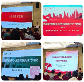 中山大学黎红雷教授、华南师范大学伟德国际1946bv官网副经理胡国胜教授、暨南大学刘金山教授、顺德职业技术公司李霞教授分别围绕《儒家的核心价值观及其现代转化》《习近平强军思想》《宏观经济形势与新质生产力发展》《思政课教学成果的培育与申报体会》作专题报告。三位比赛获奖教师代表也分别在培训会上做了课程教学展示。