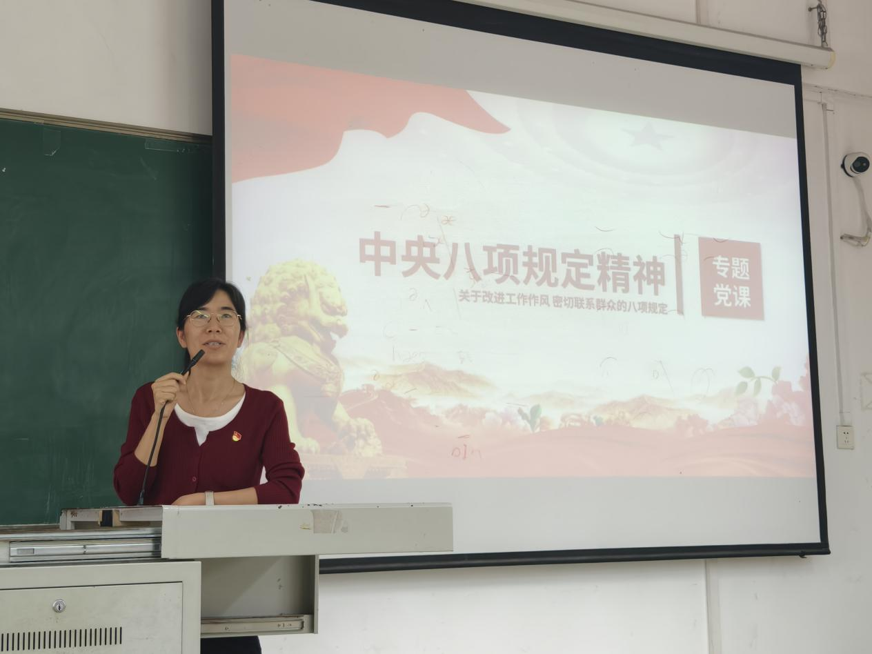 会上,党支部书记王鲜首先传达了中共中央办公厅《关于在全党开展深入贯彻中央八项规定精神学习教育的通知》,并带领全体党员系统学习《深入贯彻中央八项规定精神学习教育》主题党课。她围绕八项规定的核心要义、主要内容、关键词等进行了深入讲解,强调作风建设必须“常抓不懈、久久为功”,要求全体党员切实提高政治站位,增强纪律意识,做到内化于心、外化于行。